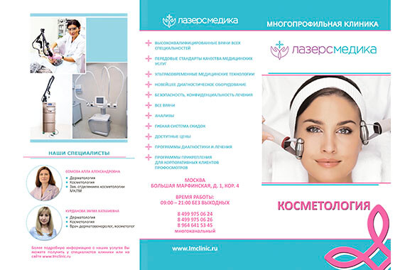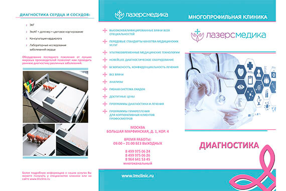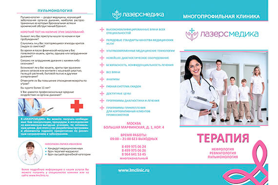 - Буклеты с лаконичной и полезной информацией о клинике, услугах и акциях, предназначенные для распространения в местах скопления людей и ожидания.
